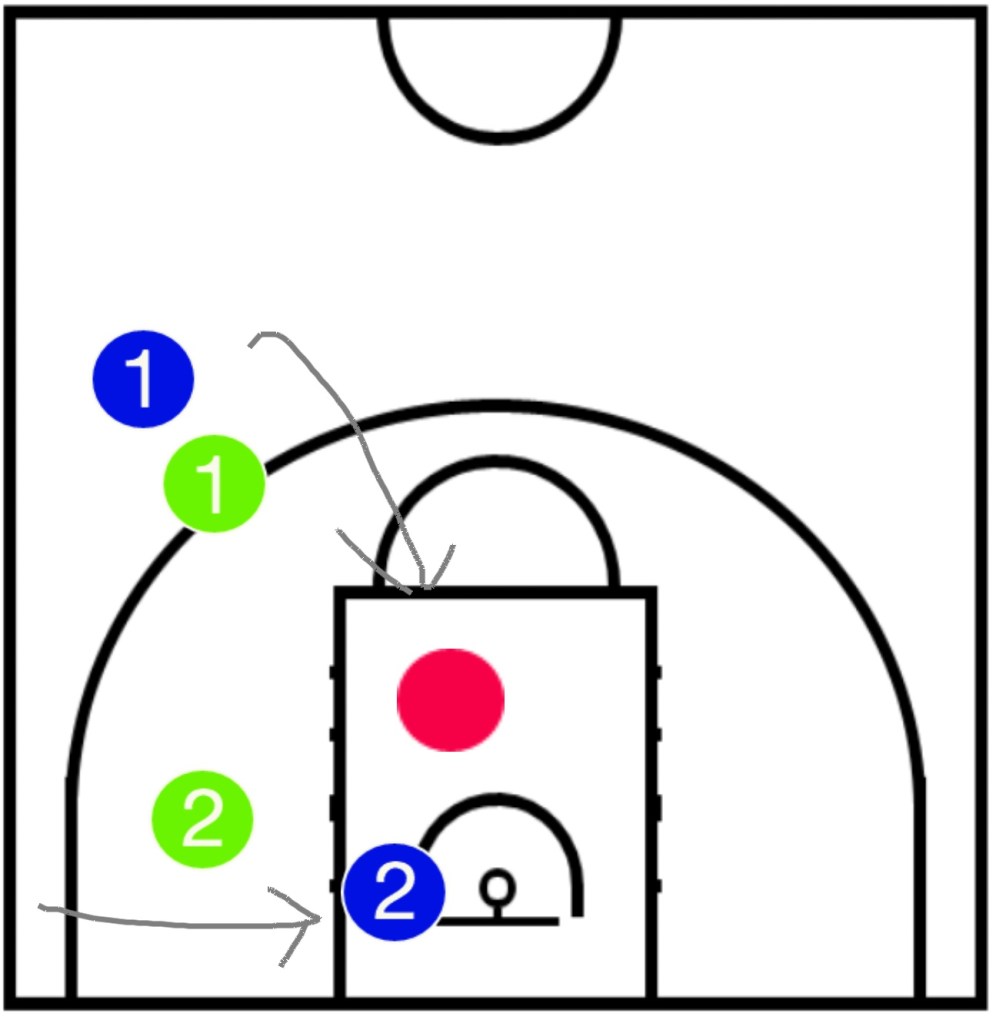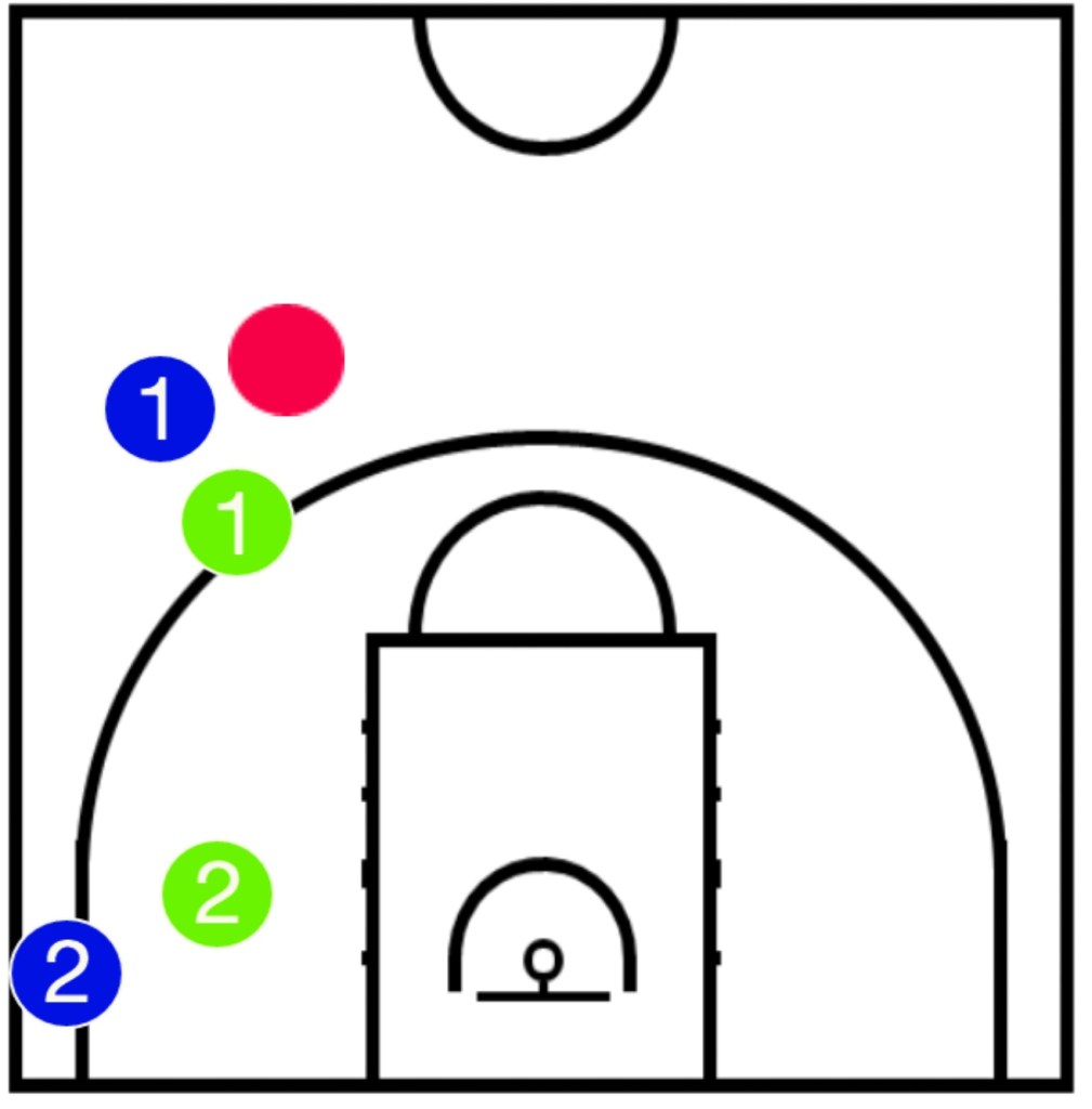 一度これを成功させると、今度はDFが警戒してきます。すると今度はアウトサイドシュートが打ちやすくなる。これだけでもう相手を手玉に取るような先制攻撃になります。画像1枚目のような場面では、緑2は青2(つまり自分のマークマン)とボールの両方を見ようとします。しかしこれが意外と難しく、隙がよく生まれます。その隙を突けば画像のような置き去り状態も可能です。