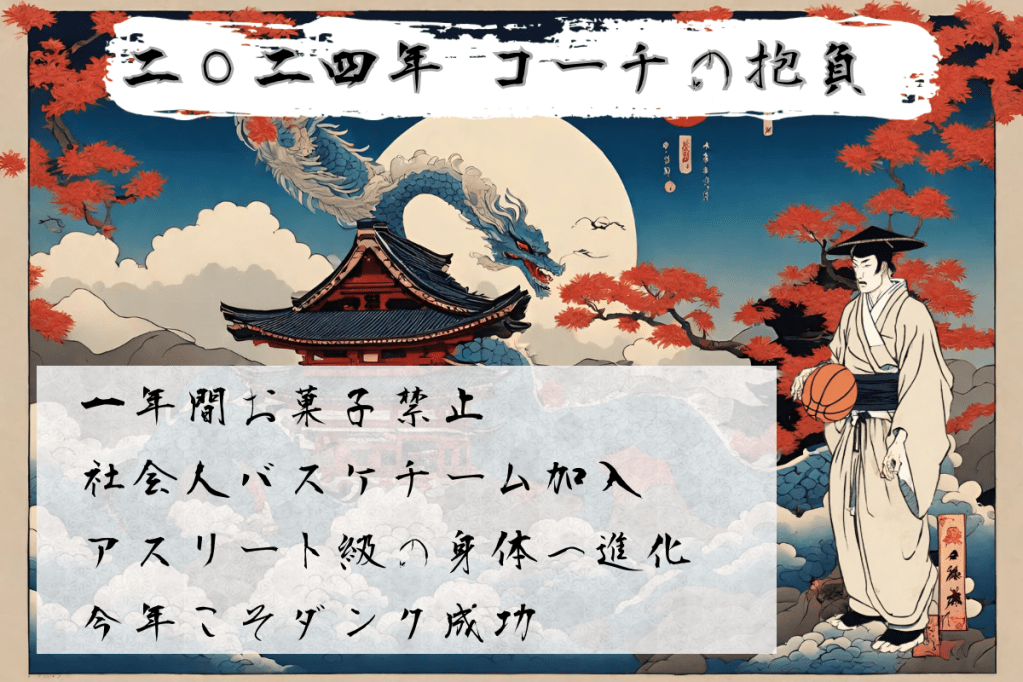 関係無いですが、1番上のあの画像、なんとこの世に1枚。というのも僕がAI生成させたものです。素晴らしい時代ですよね。浮世絵風のバスケットマン(あえて服装は和装)と今年の干支である龍。ちなみにバスケットマンは別で生成し、僕が自分で合成しました。正直、作れない画像はほとんど無いです👌