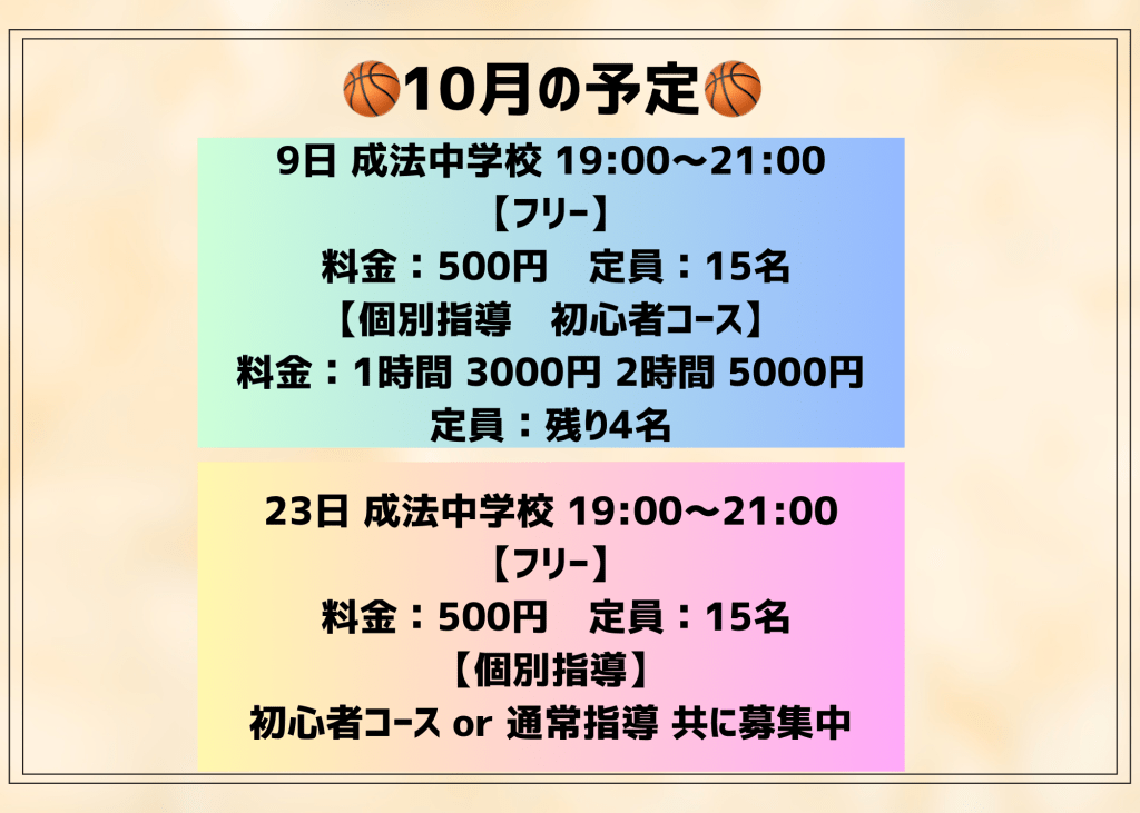 9日は初心者コースの個別指導が既に予約入っており、同じく参加したい人限定で募集します!(おそらくドリブル&シュートがメインになります)