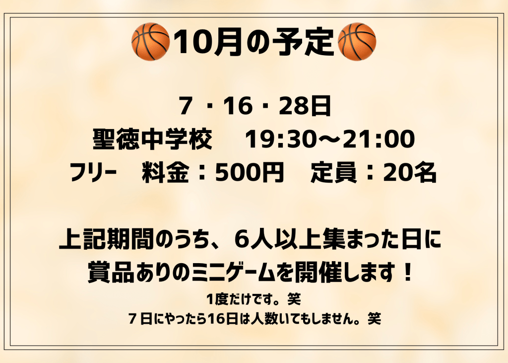【明日香】10月の予定 投稿者:コーチRyo2024年10月3日2024年10月3日カテゴリー:未分類 開催日は上記の通りです!また、記載の通り 次回 6人以上集まった時に少し賞品をかけた短時間のイベントをしようと思います🏀人数が一定以上集まったその日にするので、いつするかは決めません。笑 共有 クリックして X で共有 (新しいウィンドウで開きます) X Facebook で共有するにはクリックしてください (新しいウィンドウで開きます) Facebook クリックして友達にメールでリンクを送信 (新しいウィンドウで開きます) メールアドレス いいね 読み込み中… 投稿者: コーチRyo バスケスクールONE BY ONE代表 他の投稿を表示
