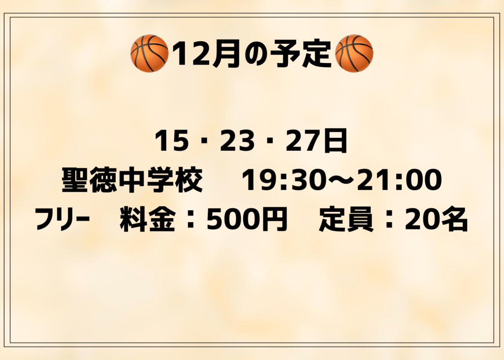 【明日香】12月の予定 投稿者:コーチRyo2024年12月6日カテゴリー:未分類 今月は体育館にたくさん空きがあったので、3回確保しました!クリスマスイベントなどはありません!笑通常開催ですが、ぜひ皆さんご参加ください🏀 共有 クリックして X で共有 (新しいウィンドウで開きます) X Facebook で共有するにはクリックしてください (新しいウィンドウで開きます) Facebook クリックして友達にメールでリンクを送信 (新しいウィンドウで開きます) メールアドレス いいね 読み込み中… 投稿者: コーチRyo バスケスクールONE BY ONE代表 他の投稿を表示