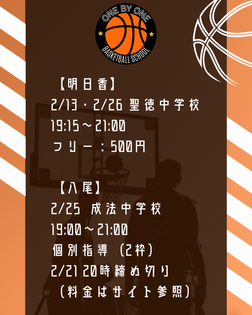 【2月の予定】 投稿者:コーチRyo2026年2月9日カテゴリー:未分類 今月からInstagramのコーチのアカウントでも予定の配信行います!今月も八尾は1回のみの開催ですが、年始初ですので、ぜひ皆さんの参加をお待ちしております😊 共有 X で共有 (新しいウィンドウで開きます) X Facebook で共有 (新しいウィンドウで開きます) Facebook 友達にメールでリンクを送信 (新しいウィンドウで開きます) メールアドレス いいね 読み込み中… 投稿者: コーチRyo バスケスクールONE BY ONE代表 他の投稿を表示